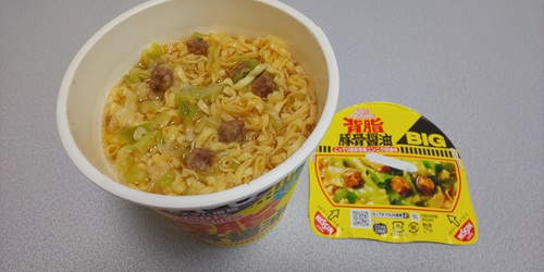 今回はカップヌードルBIGで、ガッツリ背脂豚骨醤油です。
